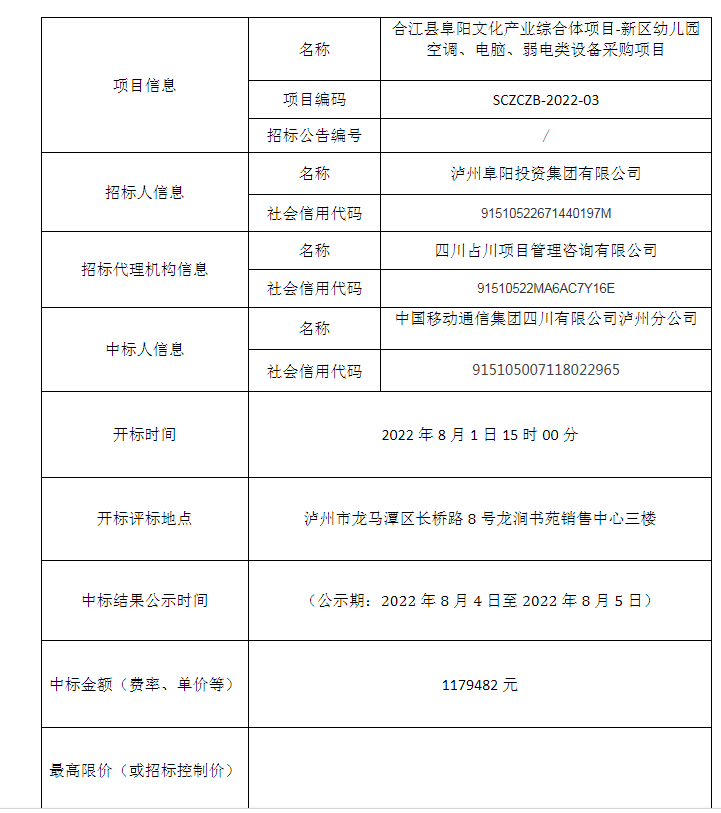 合江縣阜陽文化產業(yè)綜合體項目-新區(qū)幼兒園空調、電腦、弱電類設備采購項目公開招標中標結果公告
