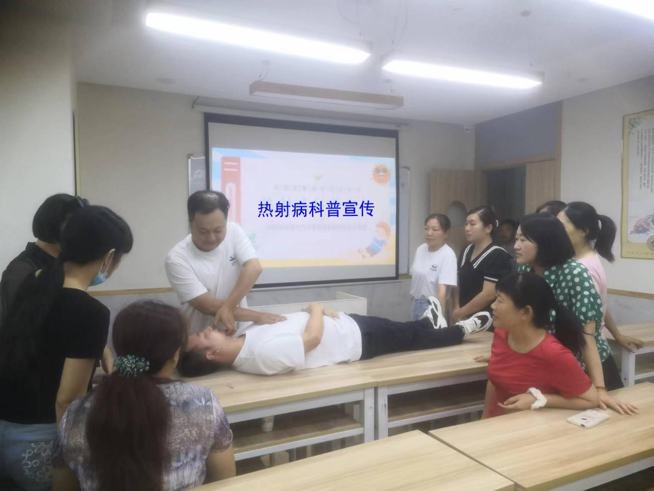 全體員工一起學(xué)習(xí)熱射病的各種防范措施并進(jìn)行熱射病的急救演練。 提高大家預(yù)防熱射病的意識, 筑牢全校師生的健 康和安全防范屏障,為暑期課程撐起夏日“保護(hù)傘”。
